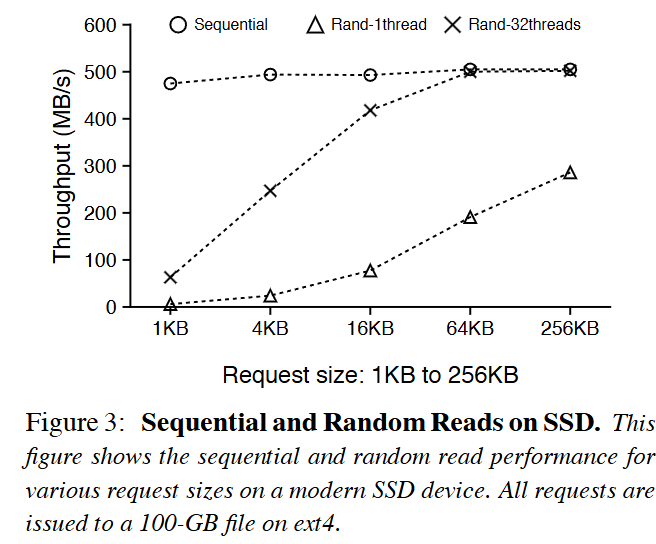 与 HDD 不同,SSD 的 随机读和顺序读之间的性能差距很小,在一些场景下,吞吐量甚至可以媲美顺序读取: